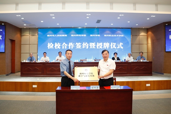 在随后举行的检校合作签约暨授牌仪式上,黄辉依次与我校、湖州学院和湖州职业技术学院签约,并为三所高校教学与研究基地授牌。