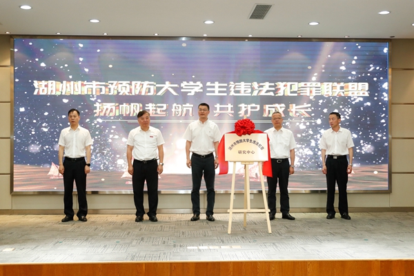 6月17日上午,湖州市预防大学生违法犯罪研究中心揭牌暨联盟成立仪式在我校举行。湖州市委副书记、政法委书记、市委教育工作领导小组组长蔡旭昶,浙江省检察院检委会专职委员沈雪中,湖州市人民检察院党组书记、检察长黄辉,湖州市委副秘书长、政法委常务副书记梅旗华,我校党委书记金佩华,校党委副书记陈永华、丁敢真,湖州学院党委副书记唐华,湖州职业技术学院党委副书记叶主出席,市中级人民法院、市公安局、市司法局、市教育局、团市委、市关工委、浙江工业大学莫干山校区、浙江科技学院安吉校区、浙江宇翔职业技术学院的相关负责人,我校党校办、组织部、学工部、研工部、教务处、人文社科处、保卫处、经济管理学院、马克思主义学院等相关单位负责人以及学生代表参加活动。