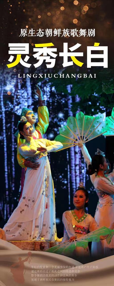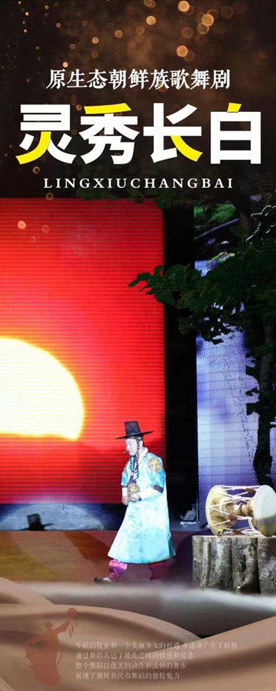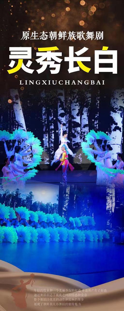 演出介绍:原生态朝鲜族歌舞剧《灵秀长白》以鸭绿江文化情真意切的为核心,以长白山、鸭绿江、朝鲜族家园为创作背景,贯穿一条从远古到现代的时间线索,分为三个篇章“父·山魂、母·河情、家·国韵”,来展示长白县人民美好生活和精神风貌,弘扬勤勉进取的长白县精神,传承优秀民族文化,创作民族优秀文艺精品,呈现一台兼具文化高度、民俗深度、精神力度的舞台剧。
