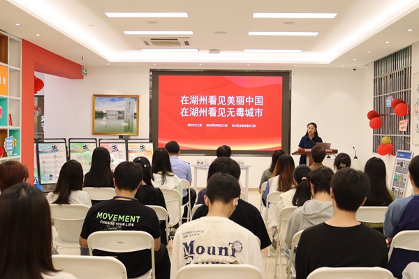 在6月26日“国际禁毒日”暨第14个全民禁毒宣传月到来之际,近日,“在湖州看见美丽中国 在湖州看见无毒城市”禁毒宣传活动在我校党群服务中心举行。本次活动由湖州市关工委、我校关工委、吴兴区龙泉街道关工委联合开展。市关工委专职副主任陈新娣、副主任熊晓红、法治教育服务团成员,我校师生代表,吴兴区龙泉街道关工委、禁毒办、派出所干部等70余人参加,活动由校关工委秘书长杨洁主持。